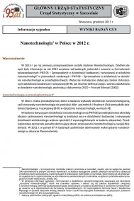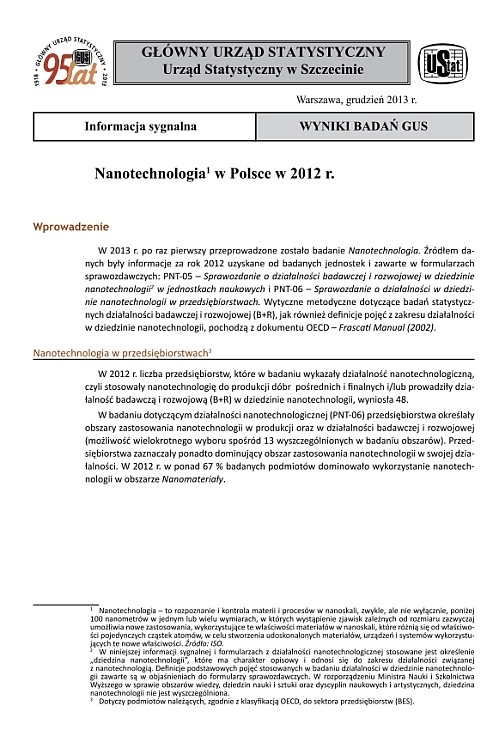 W 2013 r. po raz pierwszy przeprowadzone zostało badanie Nanotechnologia. Źródłem danych były informacje za rok 2012 uzyskane od badanych jednostek i zawarte w formularzach sprawozdawczych: PNT-05 – Sprawozdanie o działalności badawczej i rozwojowej w dziedzinie nanotechnologii w jednostkach naukowych i PNT-06 – Sprawozdanie o działalności w dziedzinie nanotechnologii w przedsiębiorstwach.