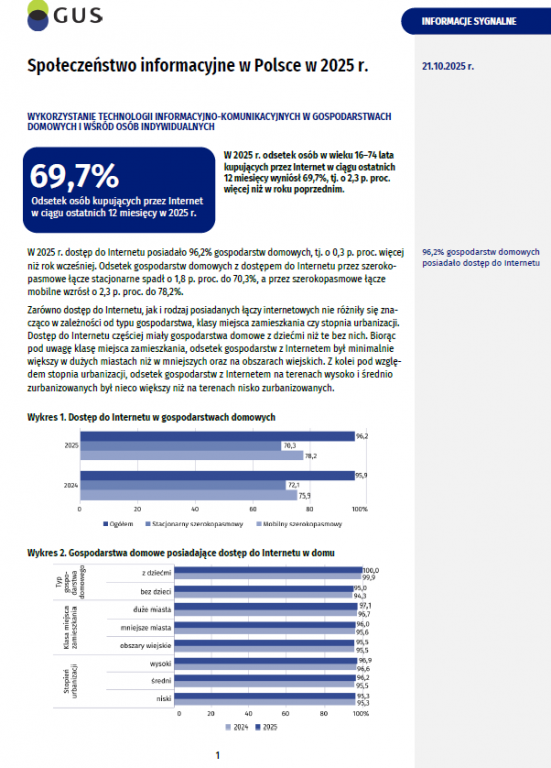 W 2025 r. dostęp do Internetu posiadało 96,2% gospodarstw domowych, tj. o 0,3 p. proc. więcej niż rok wcześniej. Odsetek gospodarstw domowych z dostępem do Internetu przez szerokopasmowe łącze stacjonarne spadł o 1,8 p. proc. do 70,3%, a przez szerokopasmowe łącze mobilne wzrósł o 2,3 p. proc. do 78,2%.